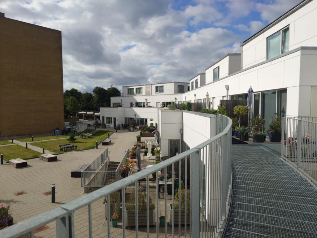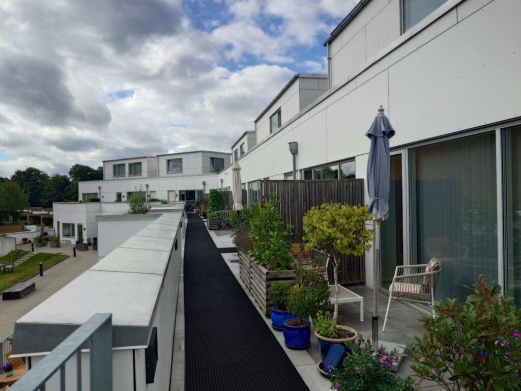 Foruden boliger er der udendørs fællesområde og et rummeligt fælleslokale med eget køkken, hvor der er plads til ca. 50 mennesker. Fra fælleslokalet er der udgang til en terrasse.